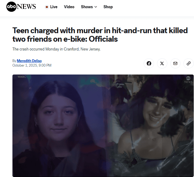 The boy had been rejected by one of the girls and he stalked her for three months. The girl’s family did everything they did to stop him. They called the police. They filed complaints n court. They tried to get restraining orders. They were all dismissed. It turns out that the boy’s father was a cop and his uncle was a police chief. Last Monday, that girl and one of her friends were riding bikes in their suburban neighborhood Cranford and that 17-year-old boy driving his family’s jeep, ran them both over and killed them. Then he posted a video of himself on social media. This is what’s going on. You know, we need the death penalty back in New Jersey.