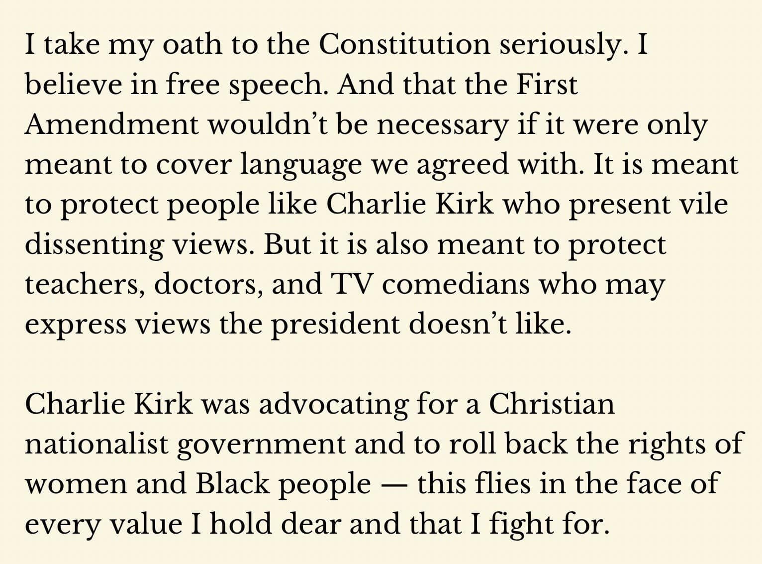She said that that Charlie Kirk’s views were “vile” and that he “advocated for a Christian nationalist government” that would “roll back the rights of women and Black people. She said that Charlie Kirk had “racist, anti-American views’.