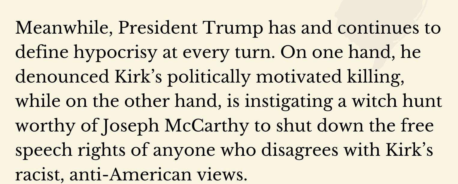 So when you want to say, let’s teach those liberals a lesson for cheering the murder of Charlie Kirk, we need to be very careful. We need to make sure that they are losing their jobs because taxpayers don’t want people like that running their schools and libraries. We have to make it clear that they are not getting fired because Trump is using the power of the government to punish his political enemies.