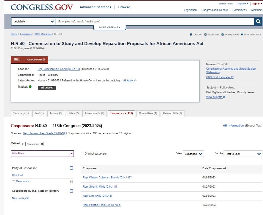 Click Here Link To Full Text of Bill and Voting Records from Congress.gov of Library of Congress: H.R.40 – 118th Congress (2023-2024): Commission to Study and Develop Reparation Proposals for African Americans Act | Congress.gov | Library of Congress