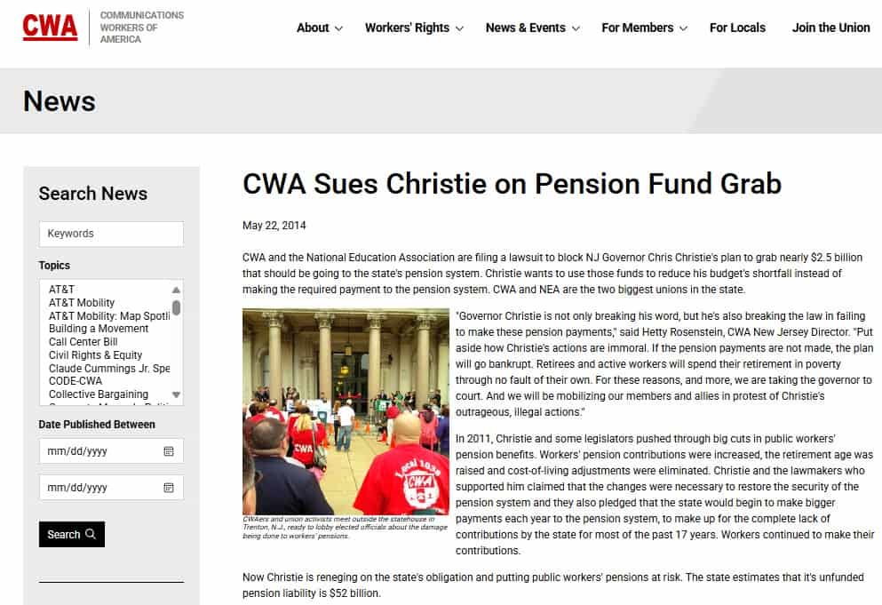 By 2014, the New Jersey pension funds were $52 billion short of what they needed to pay what they promised. Retirees were paid with current contributions of working employees–not their contributions and fund income. It was run like a Ponzi or Bernie Madoff scam. In 2014, the CWA state workers union and the NEA (Part of the NJEA Teachers’ Union) sued the State. They want the Court to mandate massive tax increases to fund the pension shortfall. However, the court denied their request. The New Jersey State Constitution states that taxpayers cannot be forced to pay debts unless voters approve them with a referendum vote. New Jersey voters never approved these pension debts. Click Here For Link To Original Post by CWA: CWA Sues Christie on Pension Fund Grab | Communications Workers of America