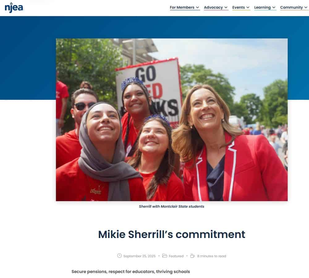Above Image: From October, 2025 Issue of NJEA Review, the official magazine of the New Jersey Teacher’s Union. The NJEA is the most powerful political organization in America. New Jersey state law forces all 103,000 New Jersey public school teachers to pay roughly $1,000 to the NJEA every year. This gives the union roughly $100 million each year to support or bully politicians in New Jersey and all over America.