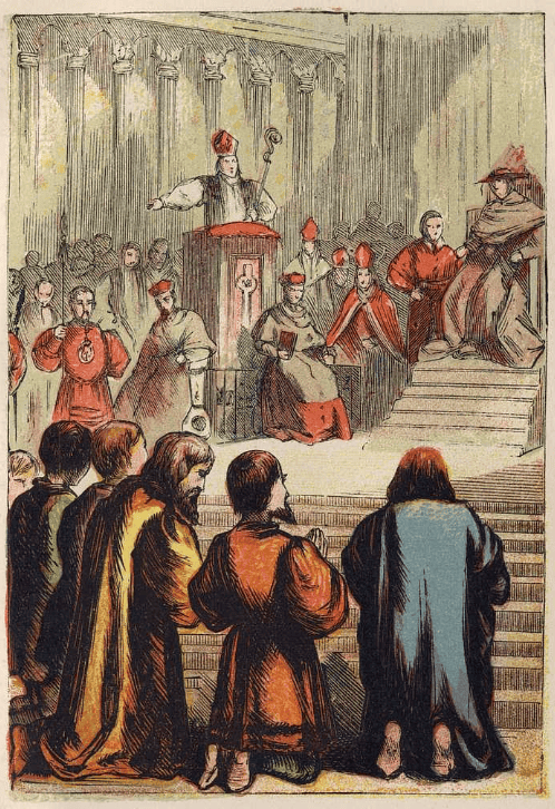 Above Above Image: (Dr. Robert Barnes) and his Fellow Prisoners Seeking Forgiveness” (1887) Illustration by Joseph Martin Kronheim. Published in Foxe’s Book of Martyrs illustrated by Kronheim, Public Domain.